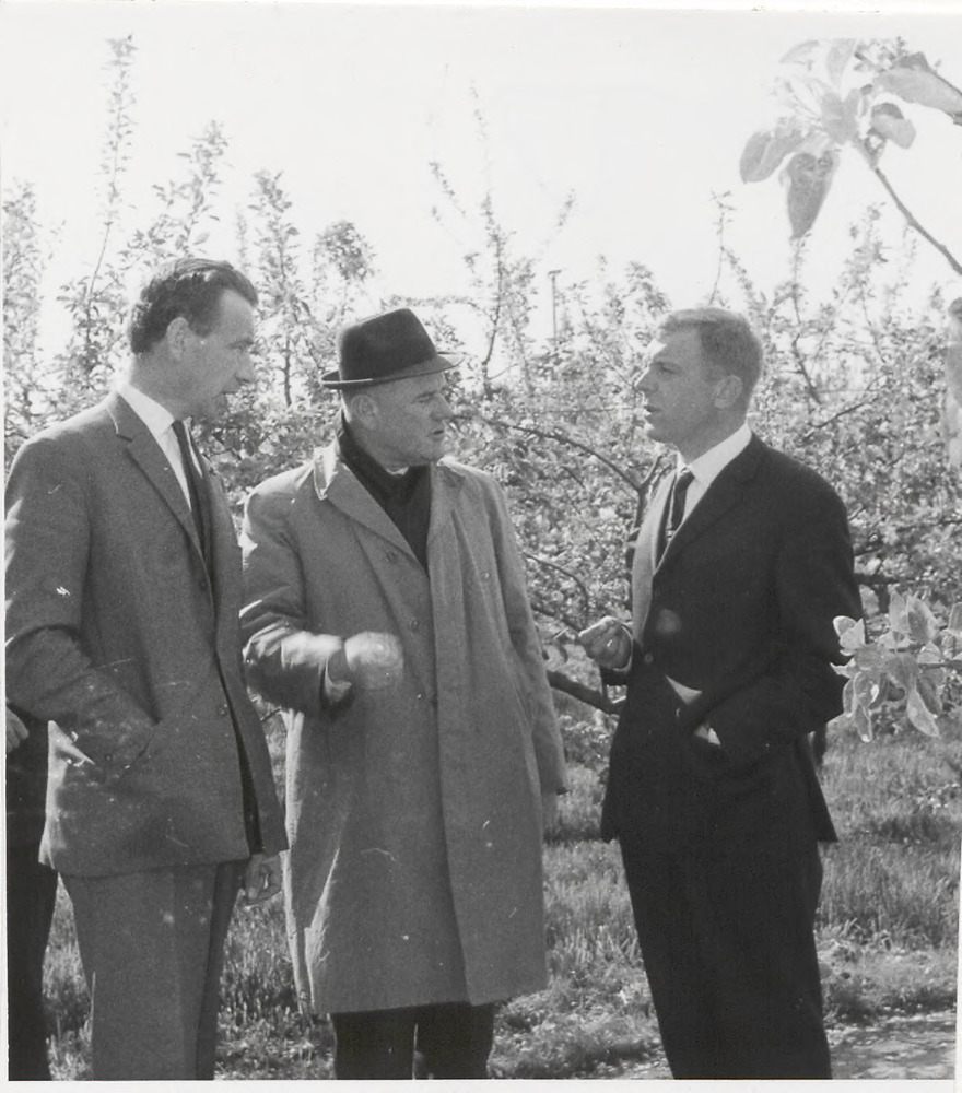 Drie heren in gesprek in bloeiende boomgaard