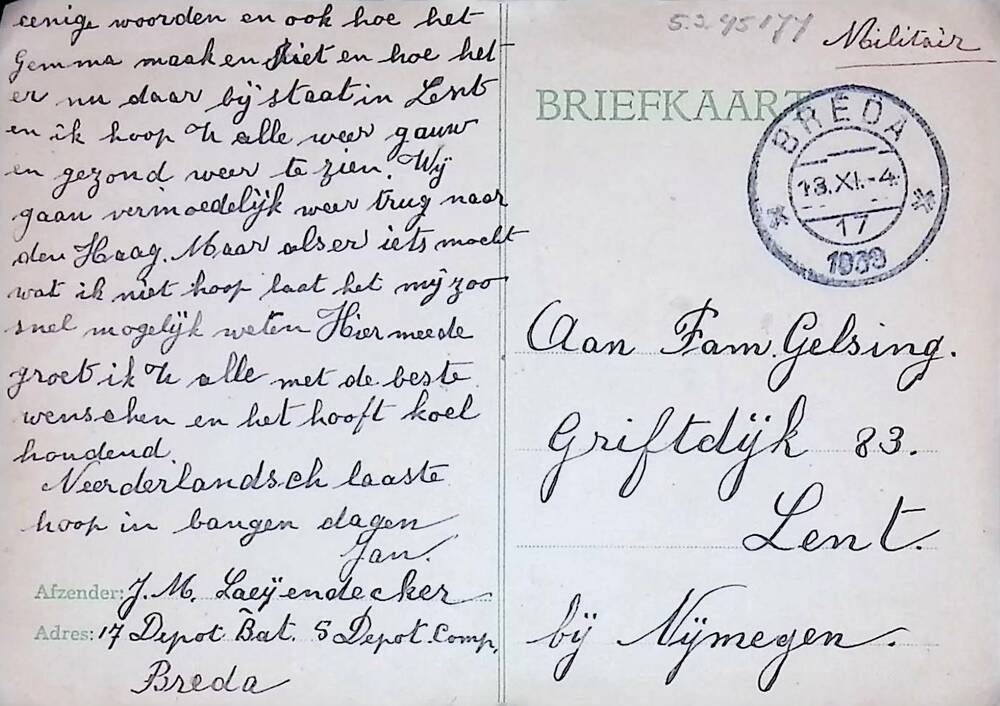 Briefkaart aan de familie Gelsing te Lent