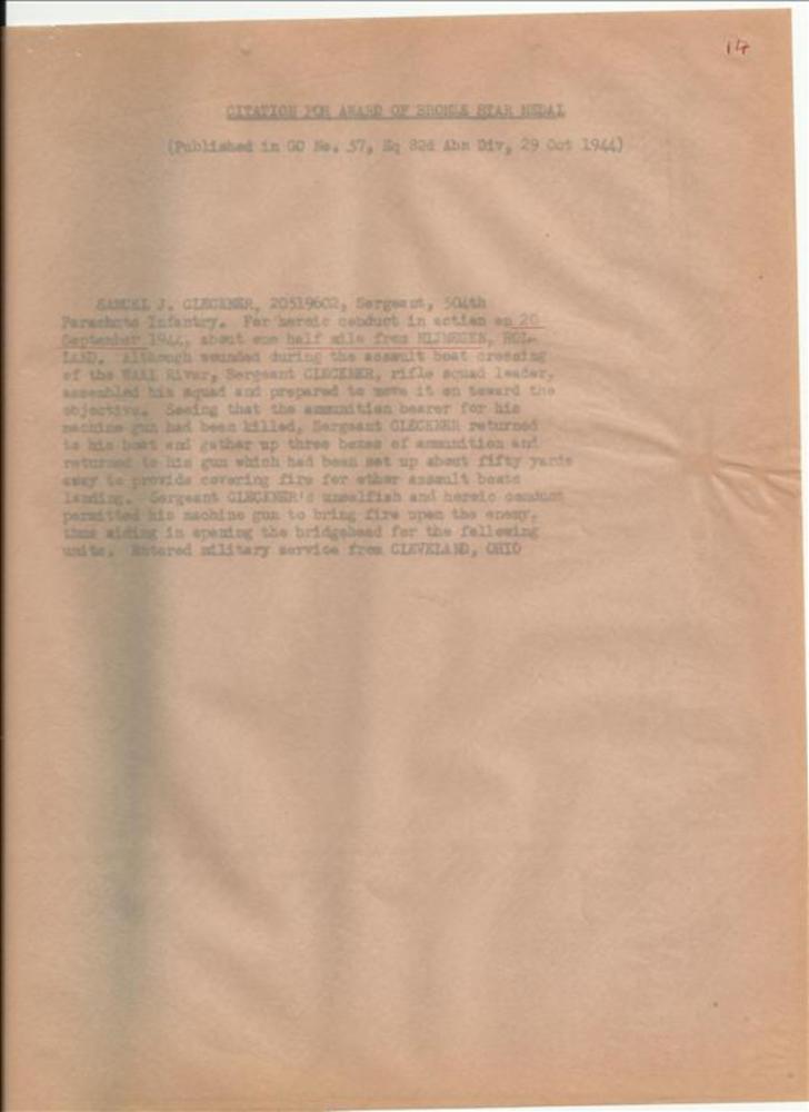 Citation for Bronze Star Medal Samuel J. Cleckner