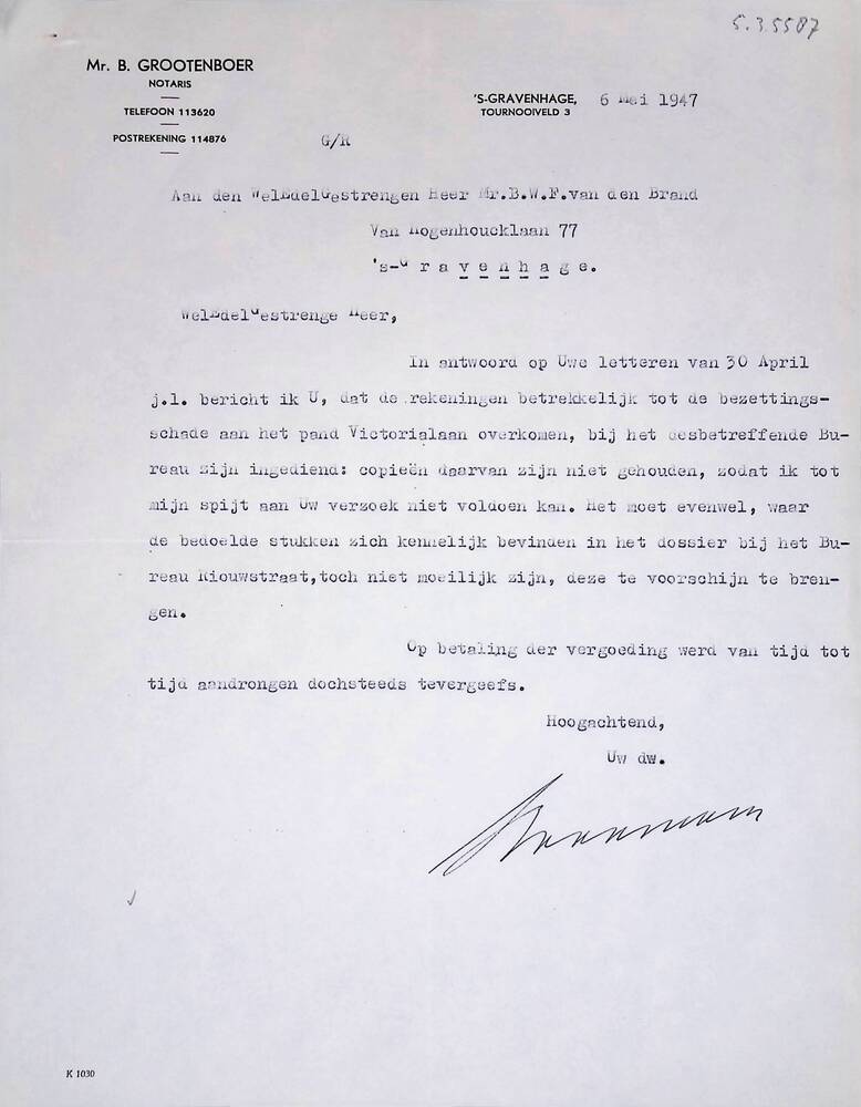 brief van B. Grootenboer aan B.W.F. v.d. Brand, 6 me...