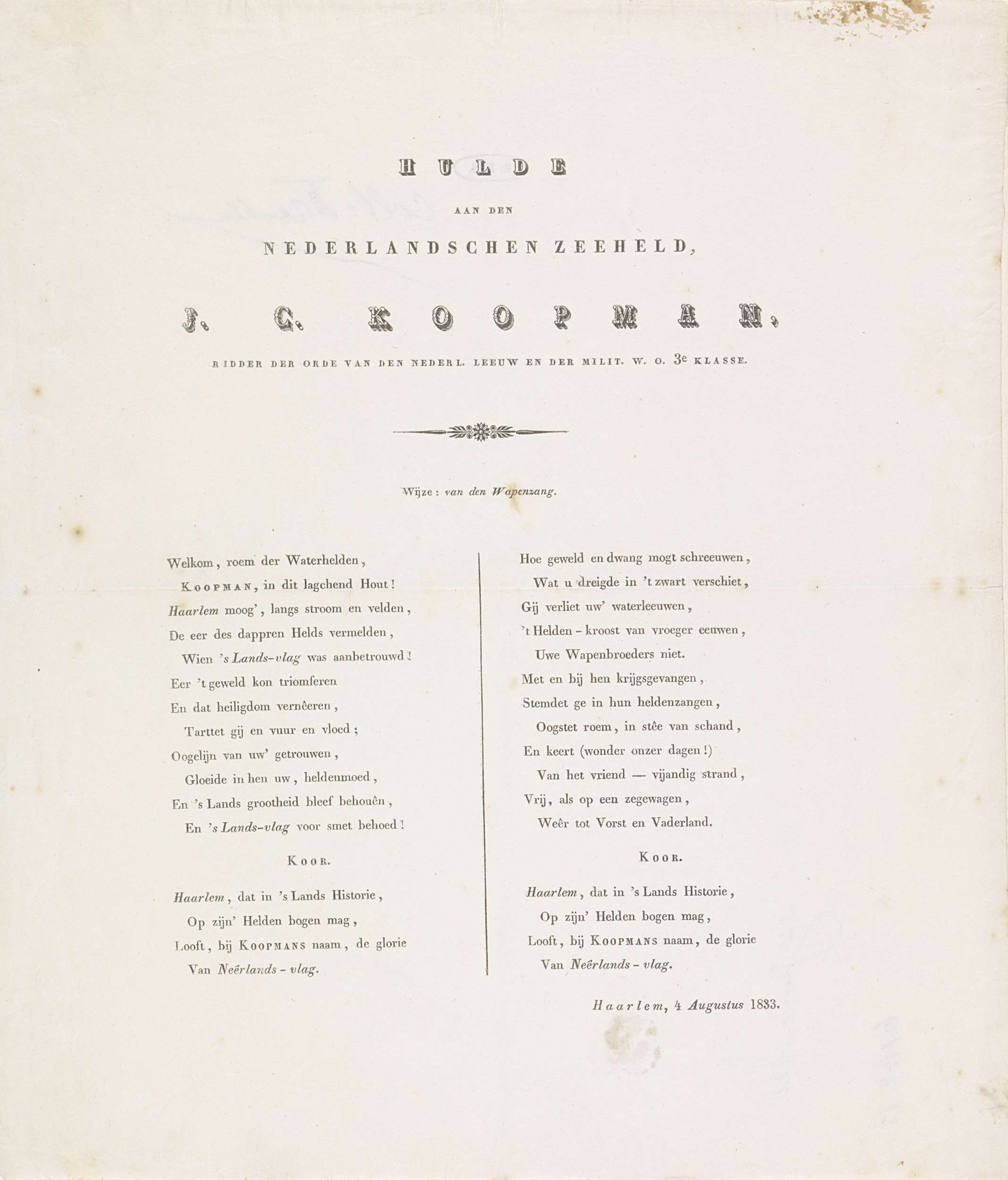 Lied ter ere van luitenant Koopman, 1833