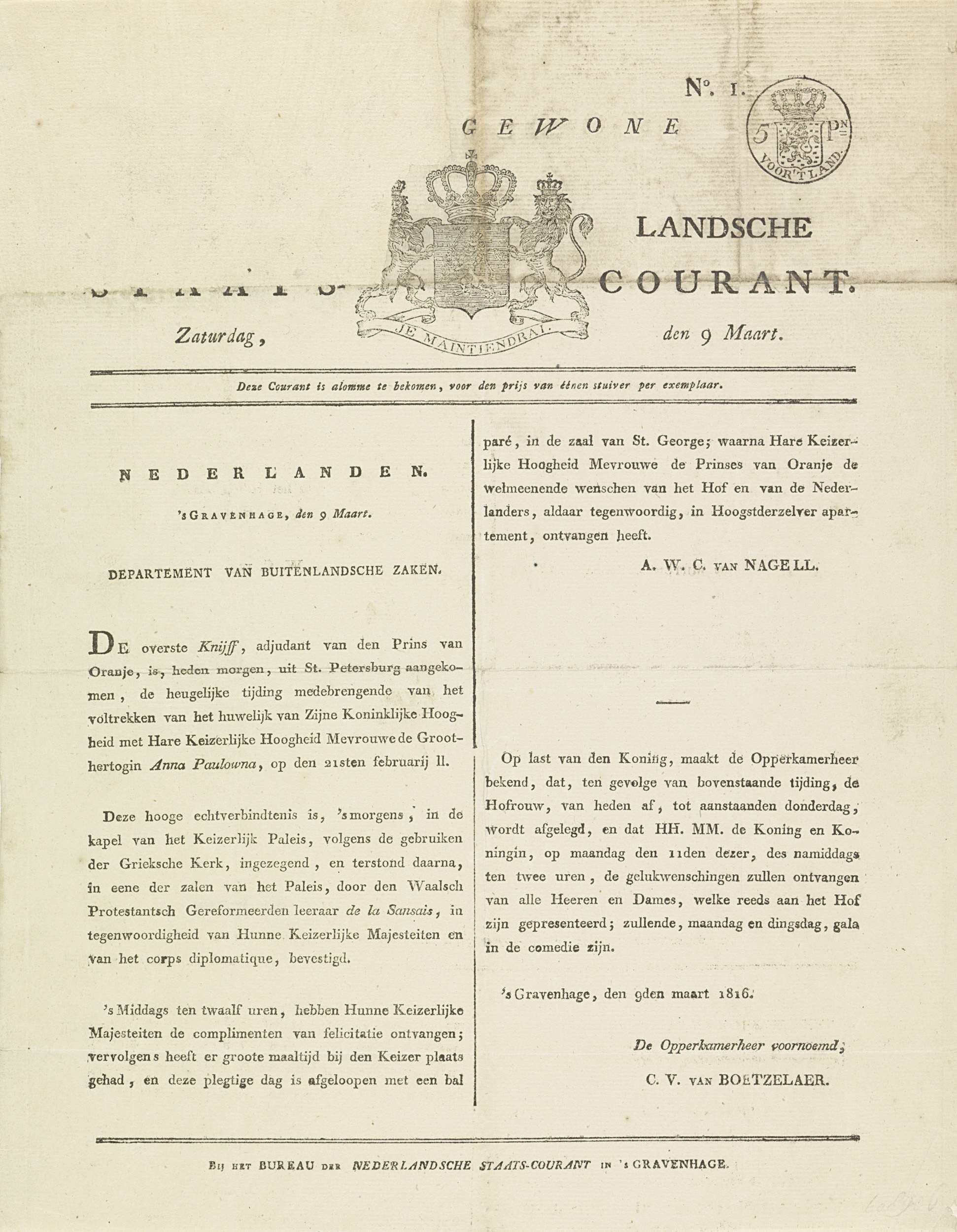 Nederlandsche Staatscourant van 9 maart 1816 met het...