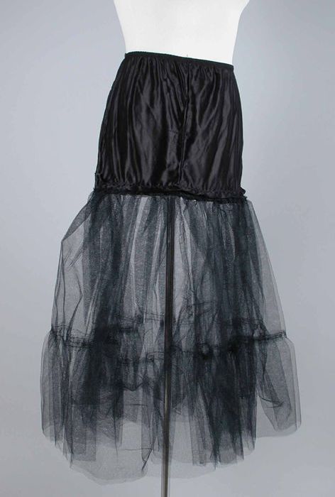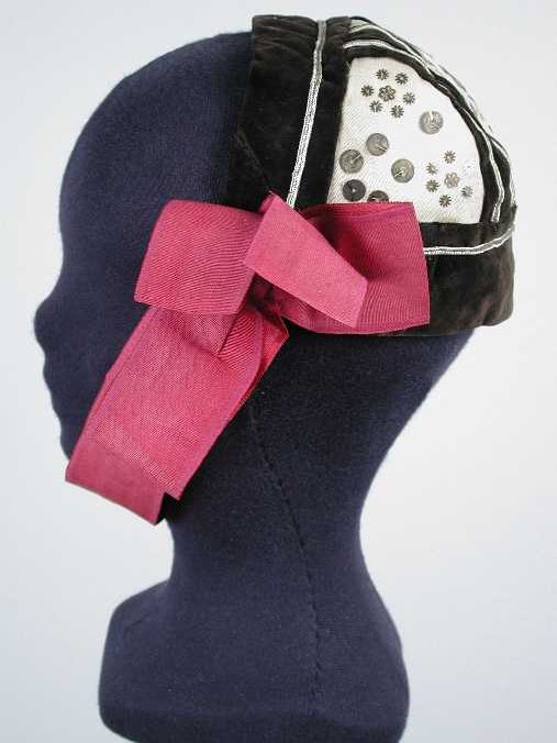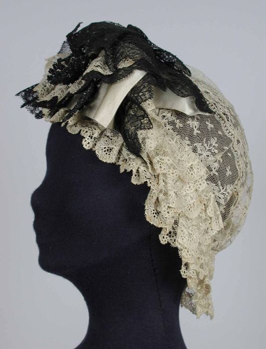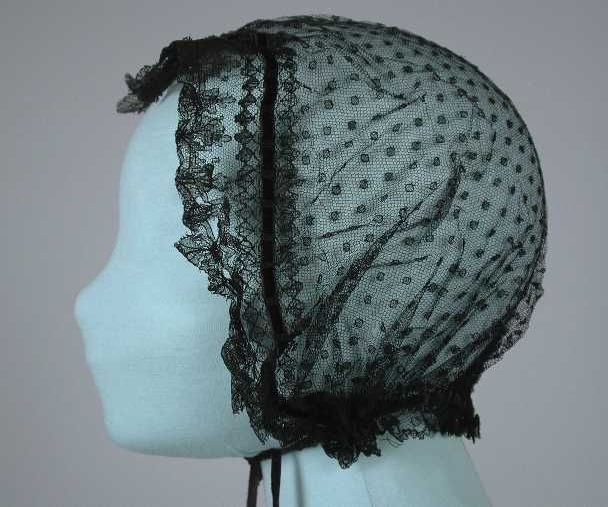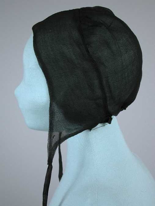 Muts van zwart crêpe, strikbanden bij de kin en midd...