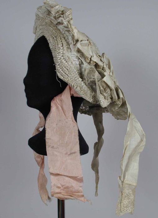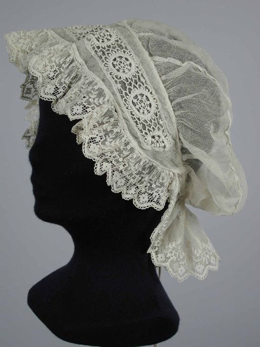 Boudoirmuts van crèmekleurige kant, geplooide ruches...