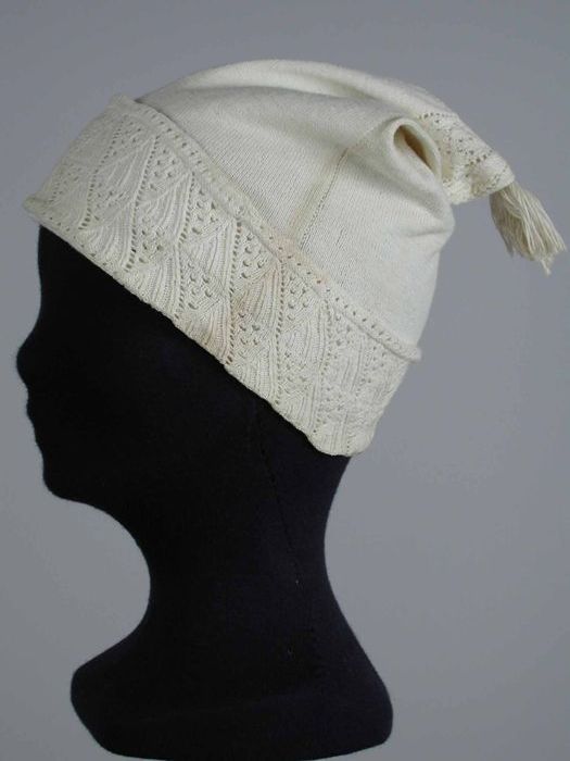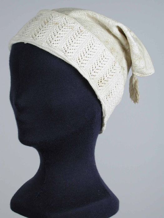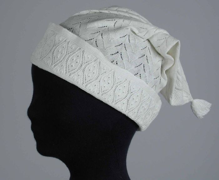 Slaapmuts gebreid van wit katoen in reliëfsteek met ...