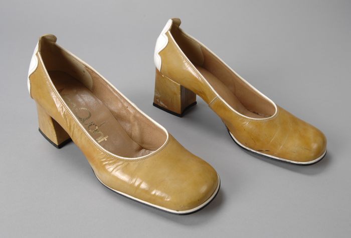 Paar pumps met blokhakken, geelgroen lakleer met wit...