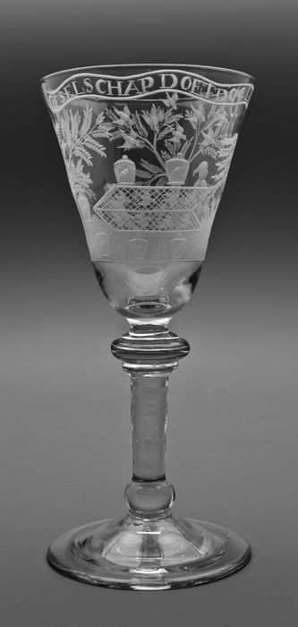 Kelkglas gegraveerd met vinkenjacht en "Geselschap d...