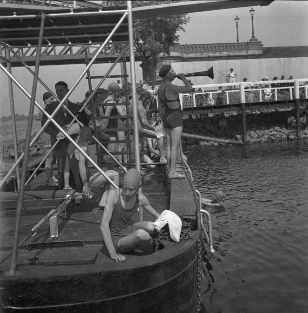 Foto, voorstellende de opening van het nieuwe zwemba...