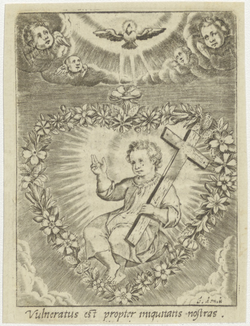 Christuskind met kruis in de wolken, kz. Bid voor zi...
