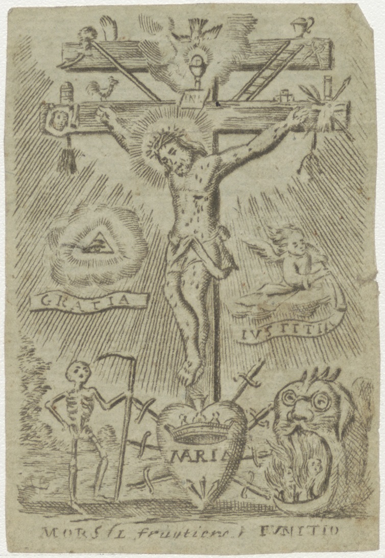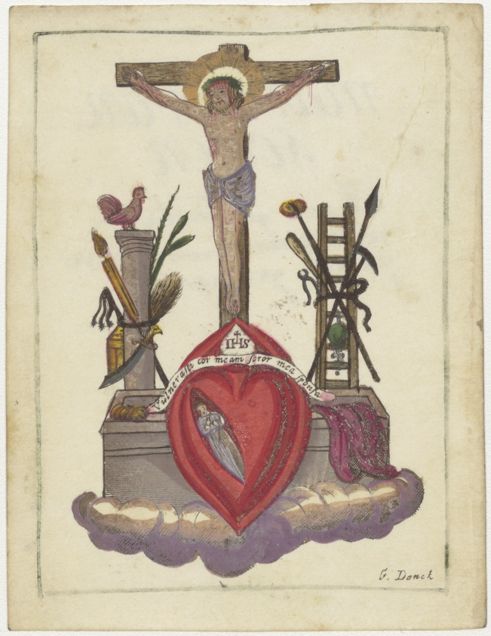 Christus aan het kruis met martelwerktuigen, H. Hart...