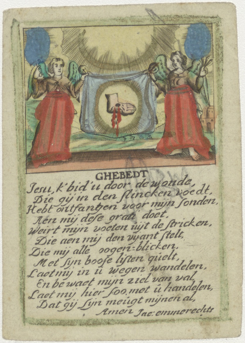 Twee engelen dragen lijkdoek van Christus, met gebed...