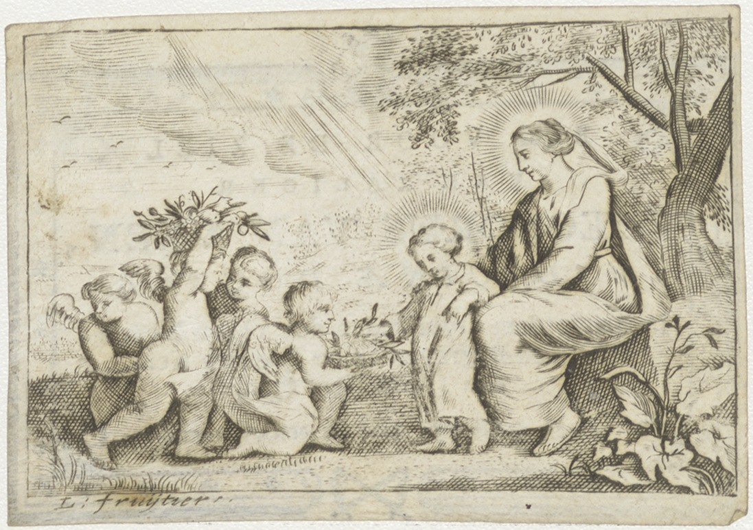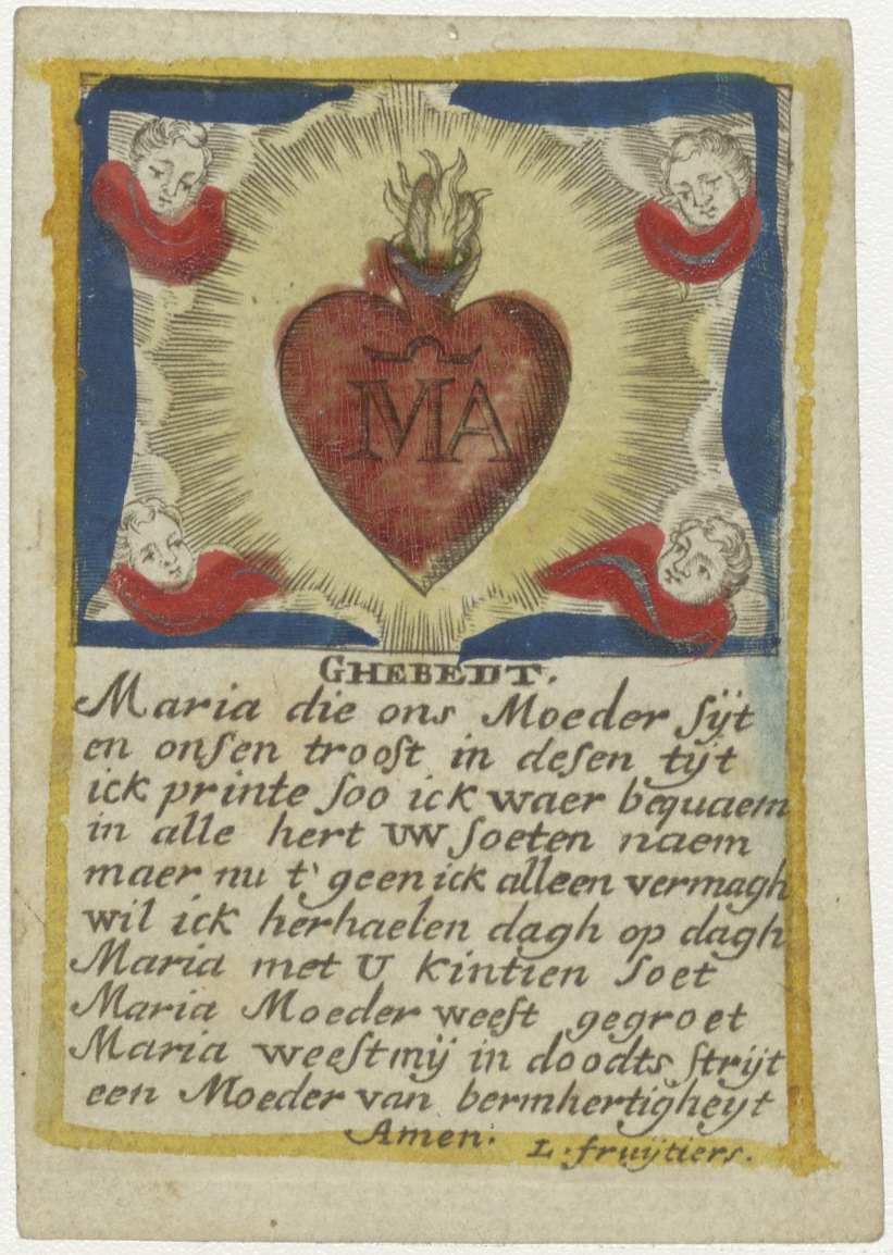 Maria met Christuskind en engelen, kz. Bid voor ziel...