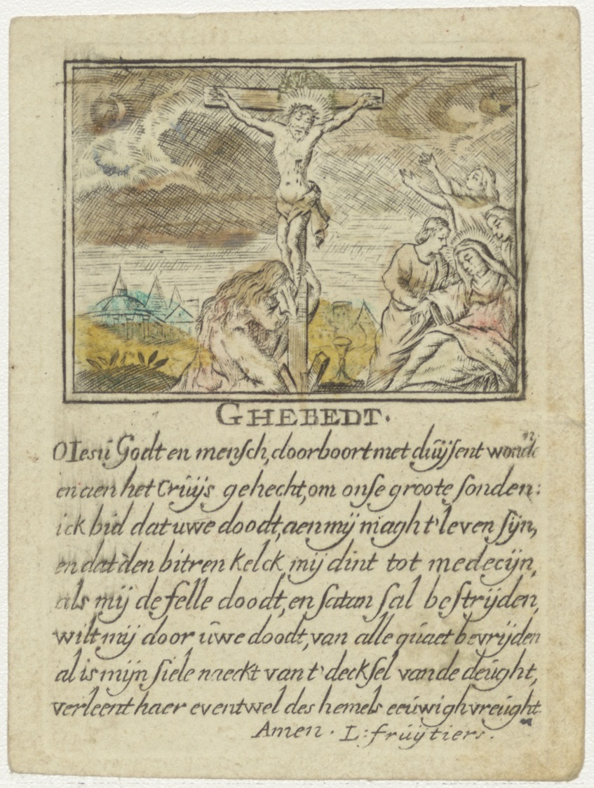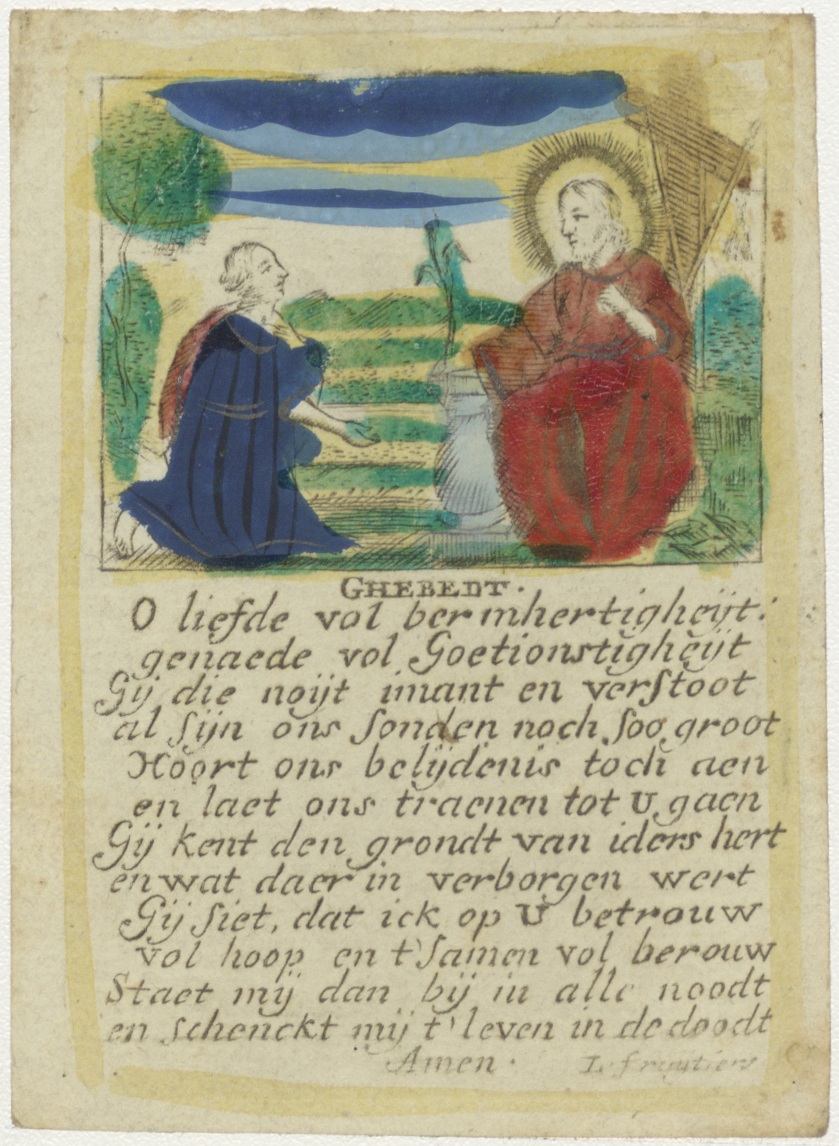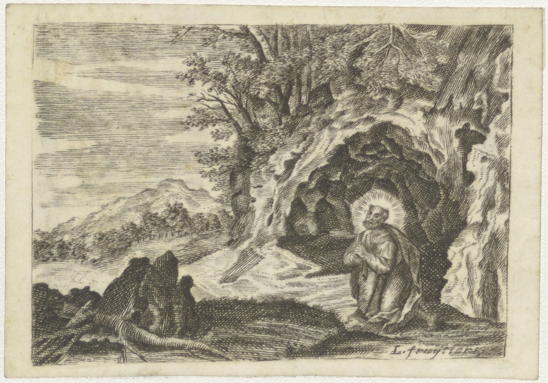 Man(?) biddend in een grot, kz. Bid voor ziel Bijvoe...
