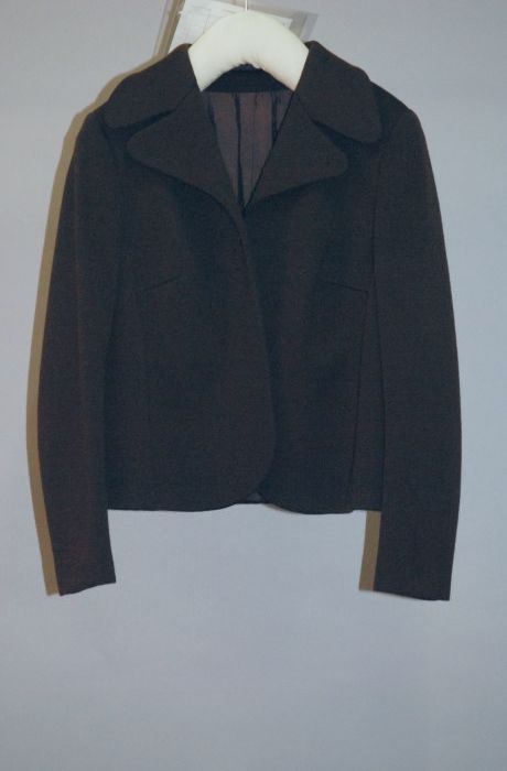 Japon met jasje van donkerbruine wollen jersey, "Mod...