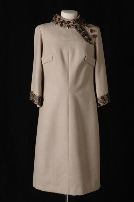 Japon van beige wollen keper, hals en mouwranden geb...