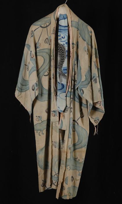 Kimono van beige linnen met dessin van blauwe golven...