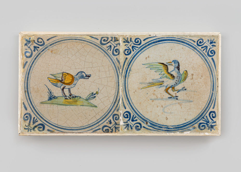 tegelveld bestaande uit twee tegels van aardewerk me...
