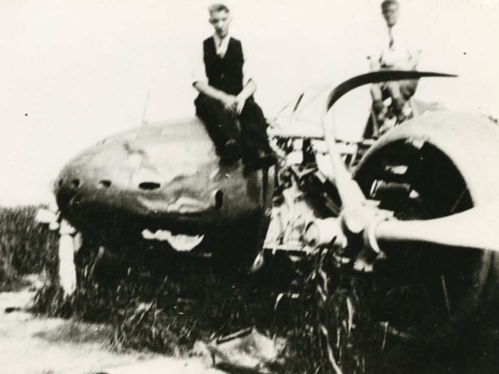 Foto twee mannen op romp wrak Fokker G-1. Tekst acht...