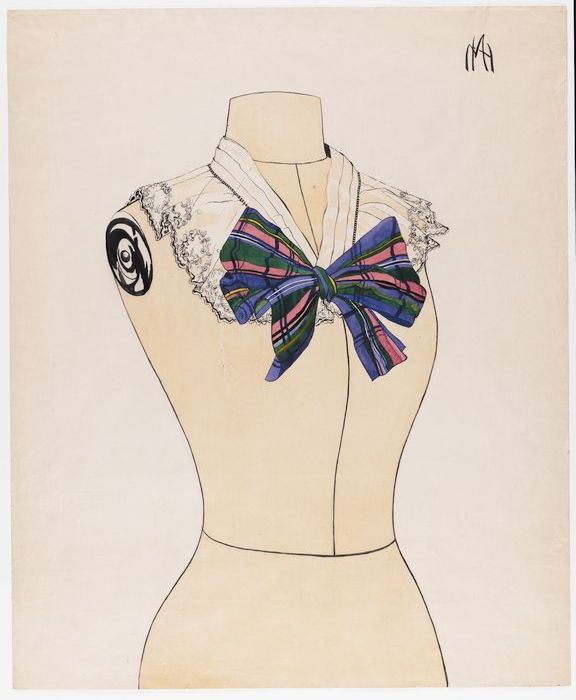 Ontwerp, tekening van kanten jabot met kleurige zijd...