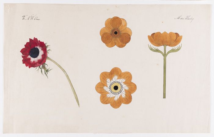 Vier tekeningen van anemonen en gestileerde details,...
