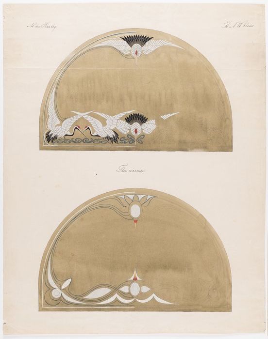 Twee tekeningen van een theemuts met kraanvogels, te...
