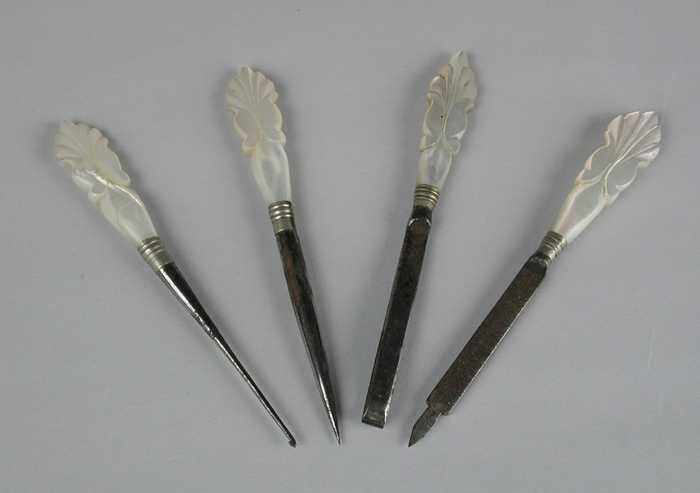Vier verschillende gereedschappen; vijl, pincet, pri...