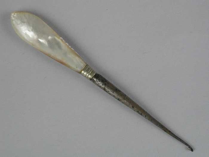 Een kleine haaknaald met pegelvormig parelmoeren han...