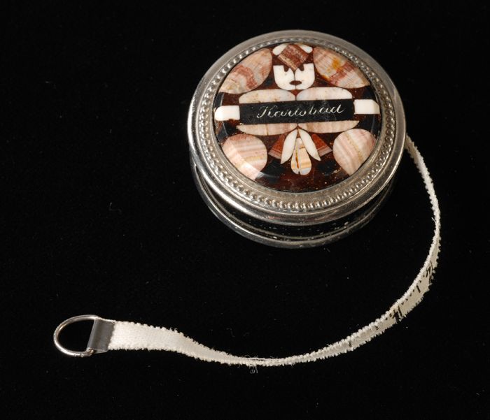 Klein rond doosje met opgerold meetlint, boven- en o...