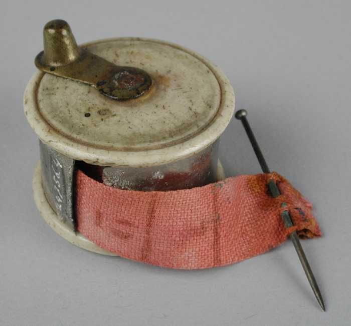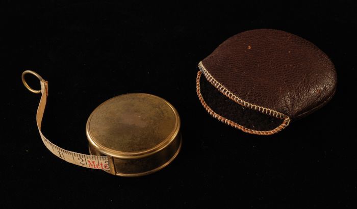 Klein rond messing doosje met daarin een meetlint, m...