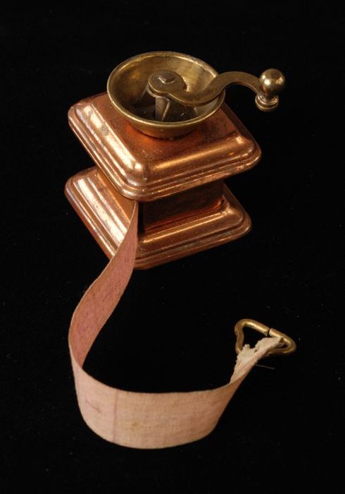 Kleine rood koperen miniatuur koffiemolen met daarin...
