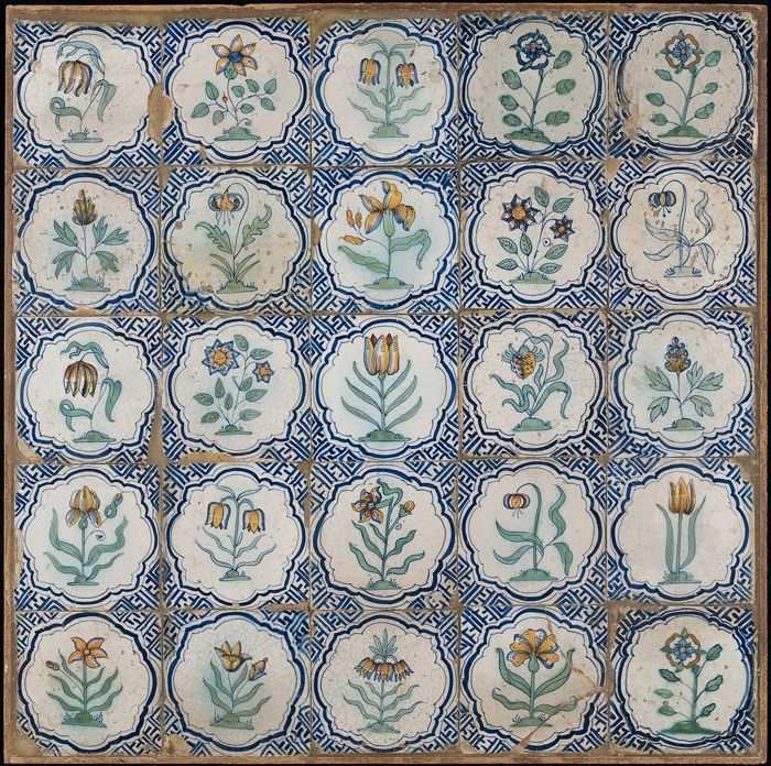 Tegelveld, vier hoog, vijf breed, tulpachtige bloeme...
