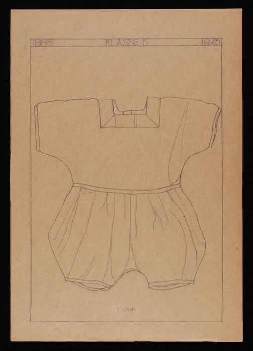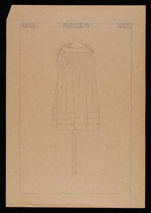 Ontwerp, tekening van gerende kinderjurk met voorpas...