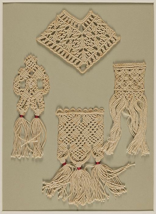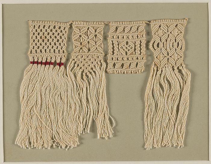 Proefstuk, vier verschillende passementen in macramé...