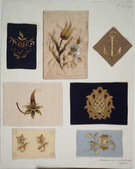 Proefstuk, zeven verschillende borduursels op versch...