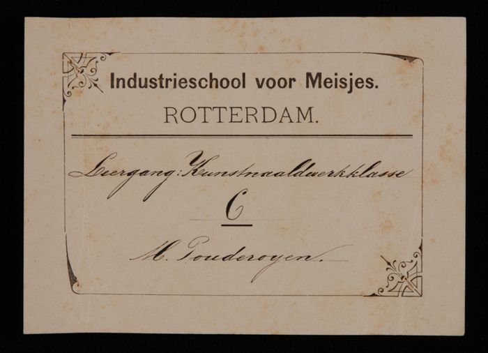 Etiket, wit karton, in zwart "Industrieschool voor M...