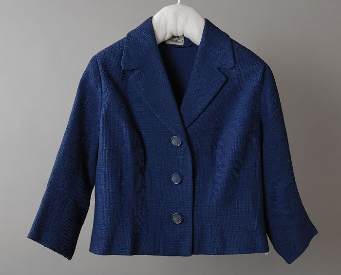 Tweedelig mantelpak, blauwe stof met wafelpatroon, "...
