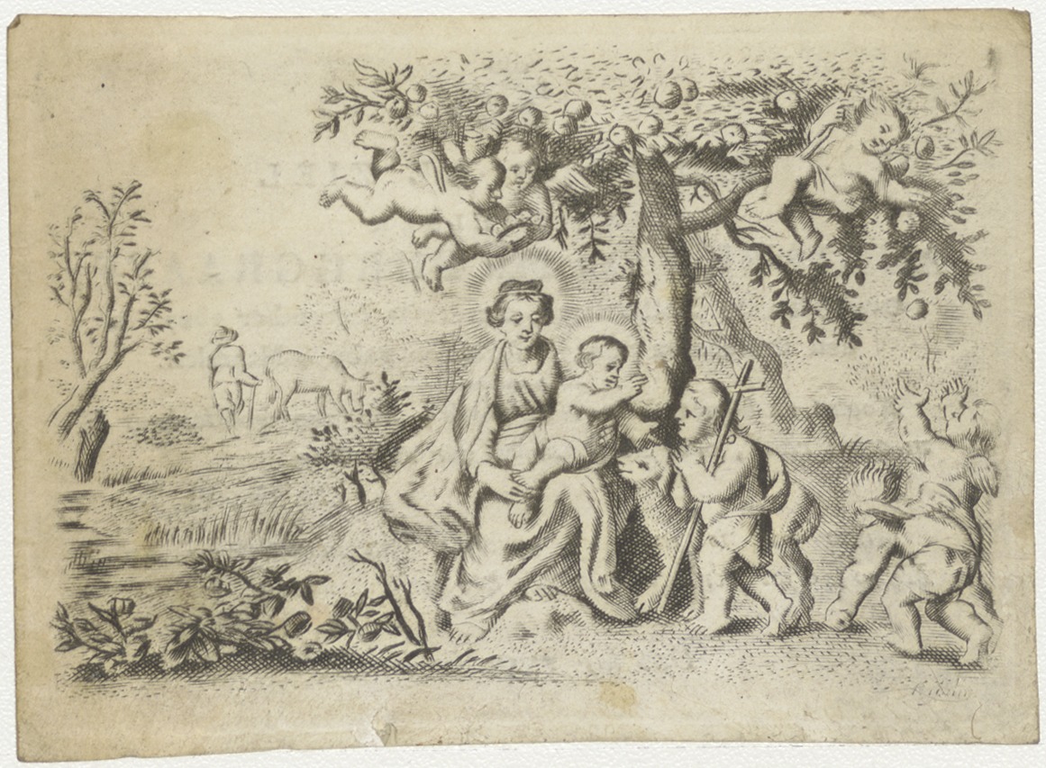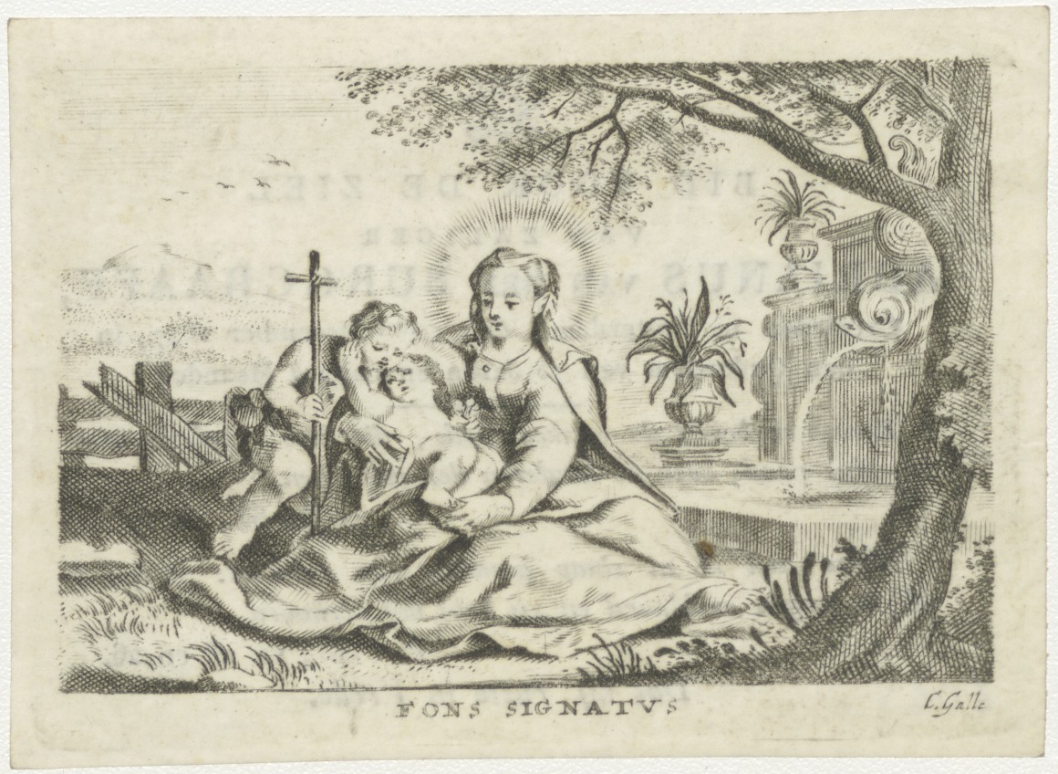 Maria met Christuskind en Johannes, kz. Bid voor zie...