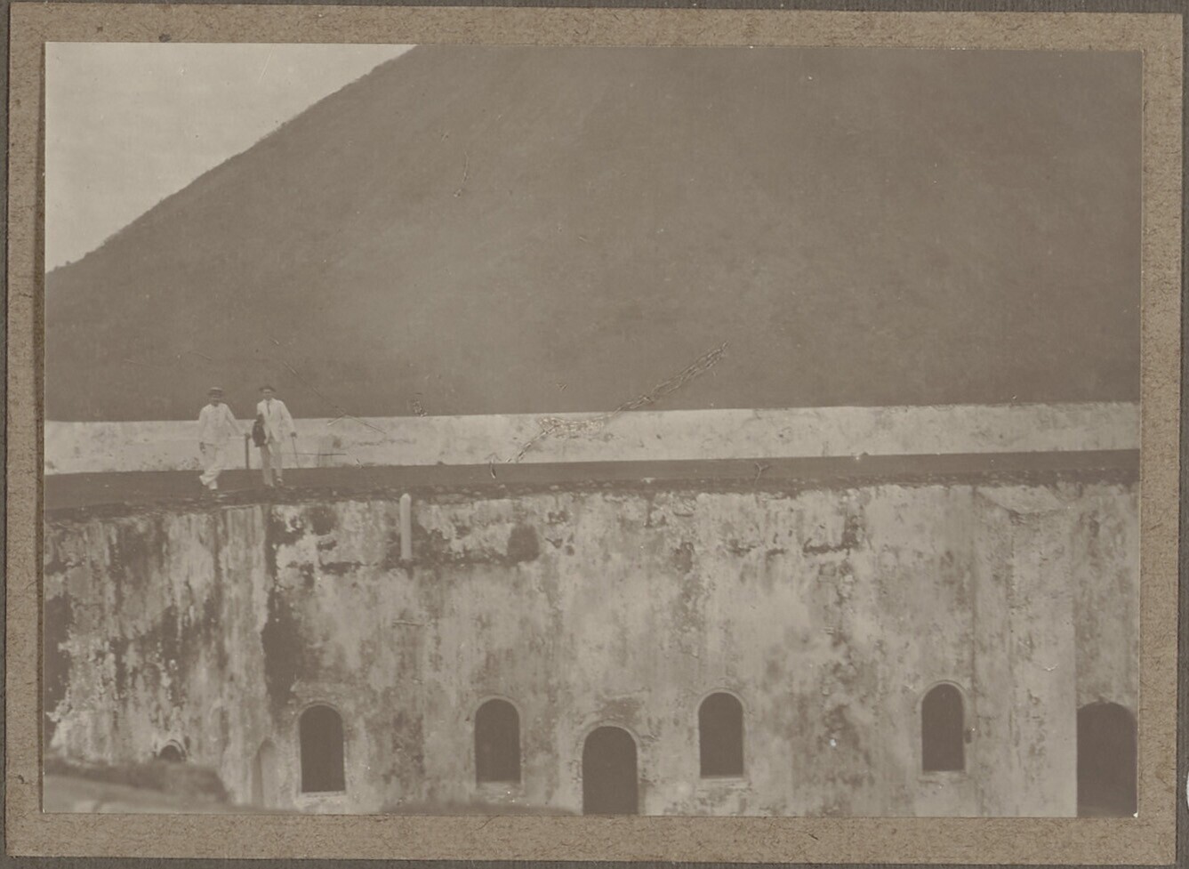 Twee mannen op de wallen van fort Belgica met op de ...