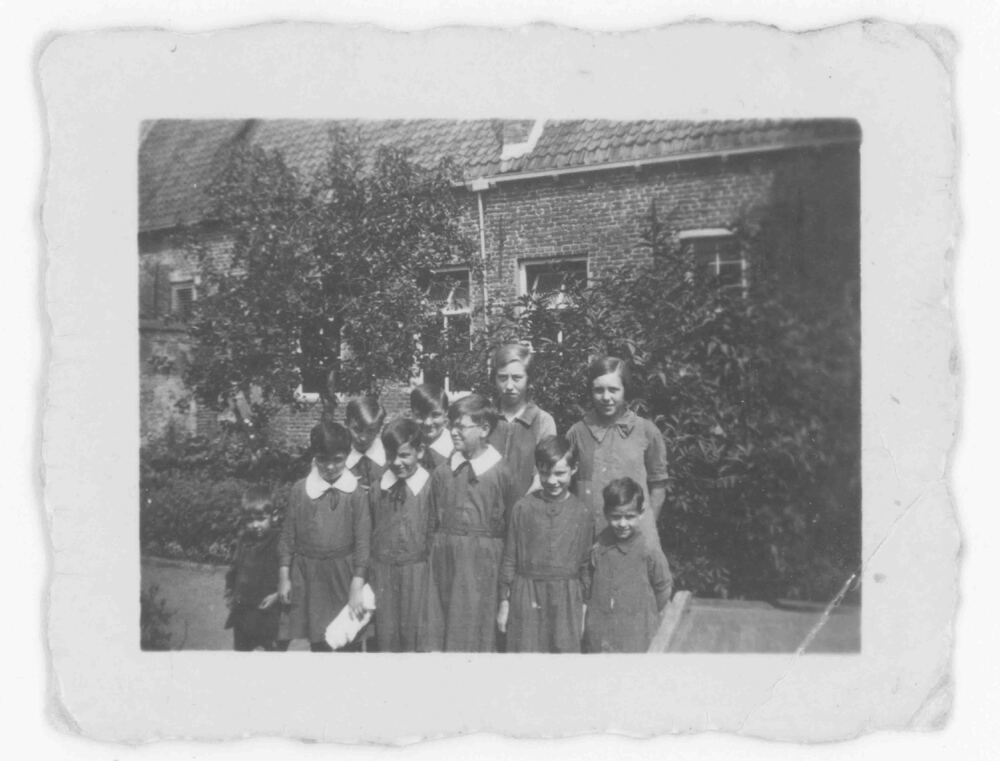 Foto, voorstellende groepje weeskinderen achter het ...