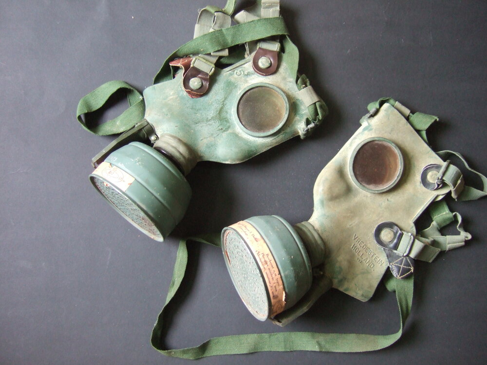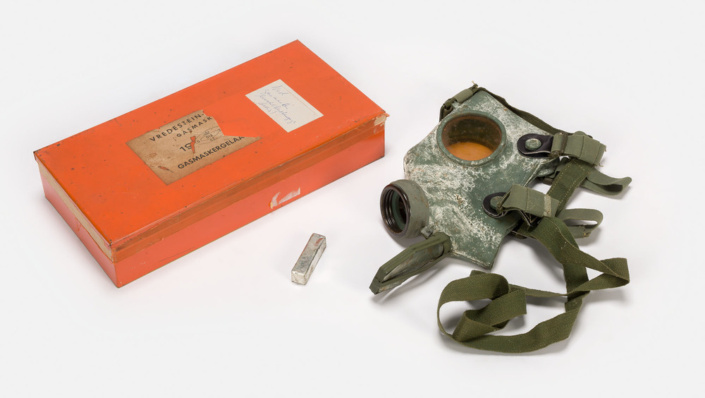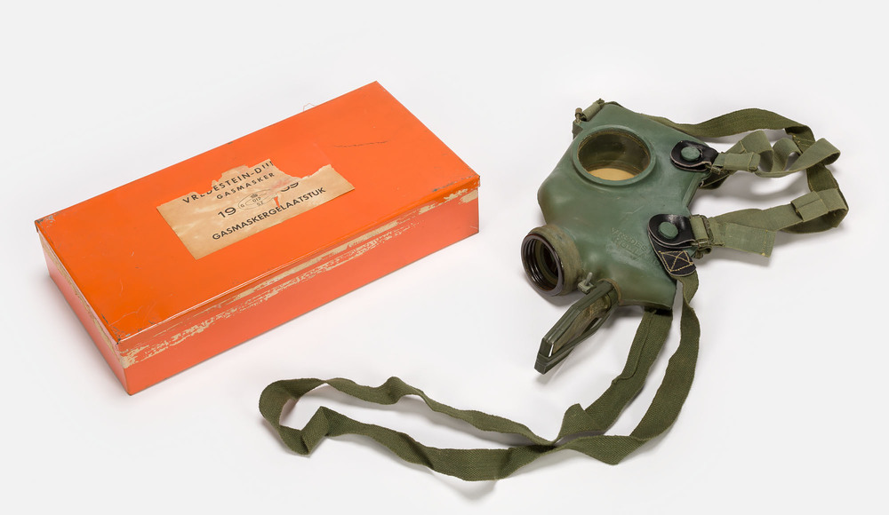 Oranje blik met een Nederlands civiel gasmasker