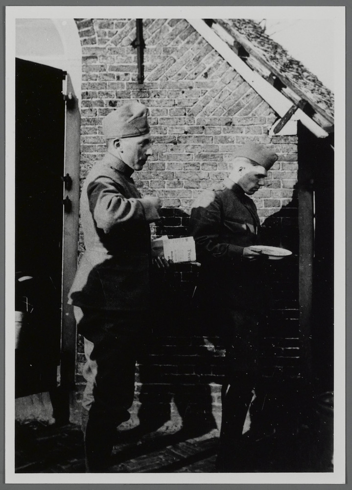Duitse militairen met flessen bier, voor een dienstg...