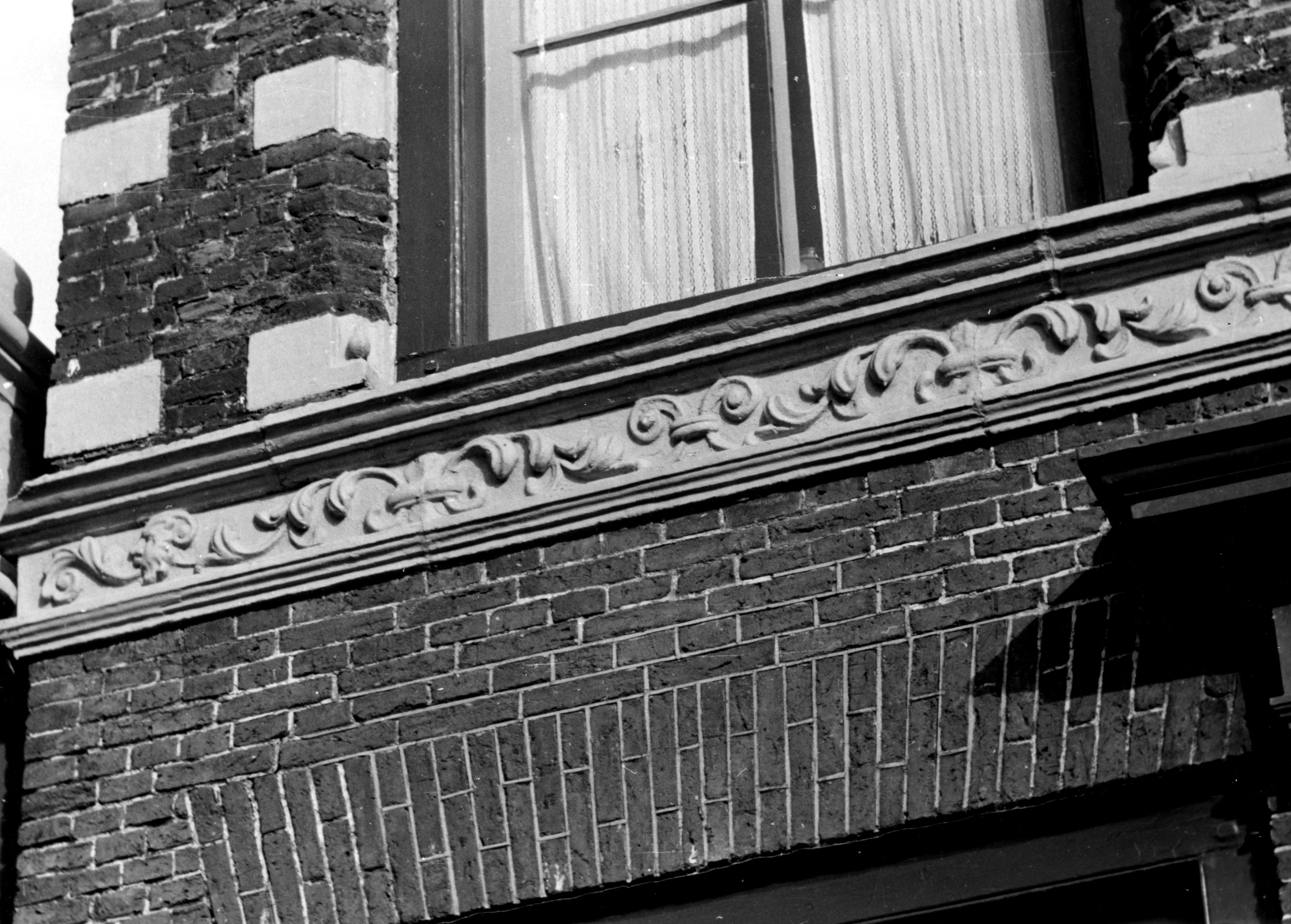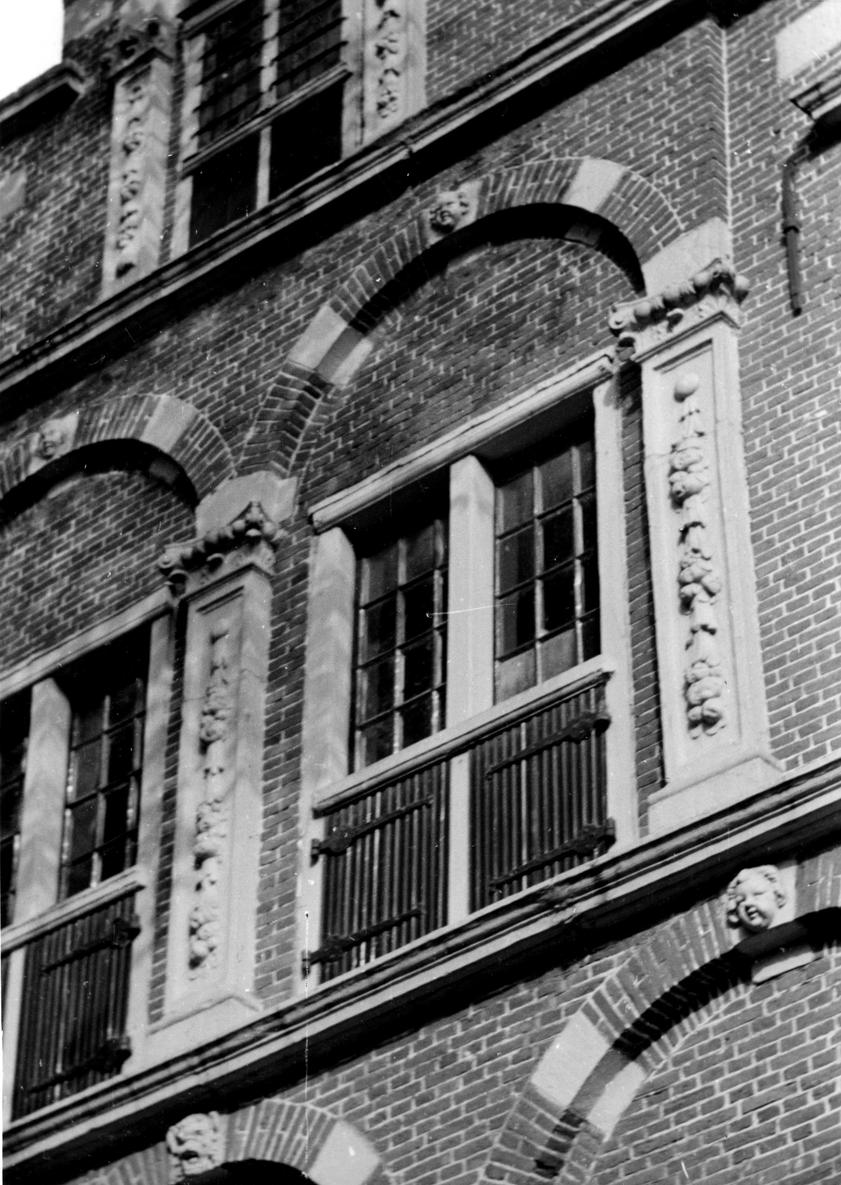 Detail van een bewerkte gevel, Workum, 1944 (zwart-w...