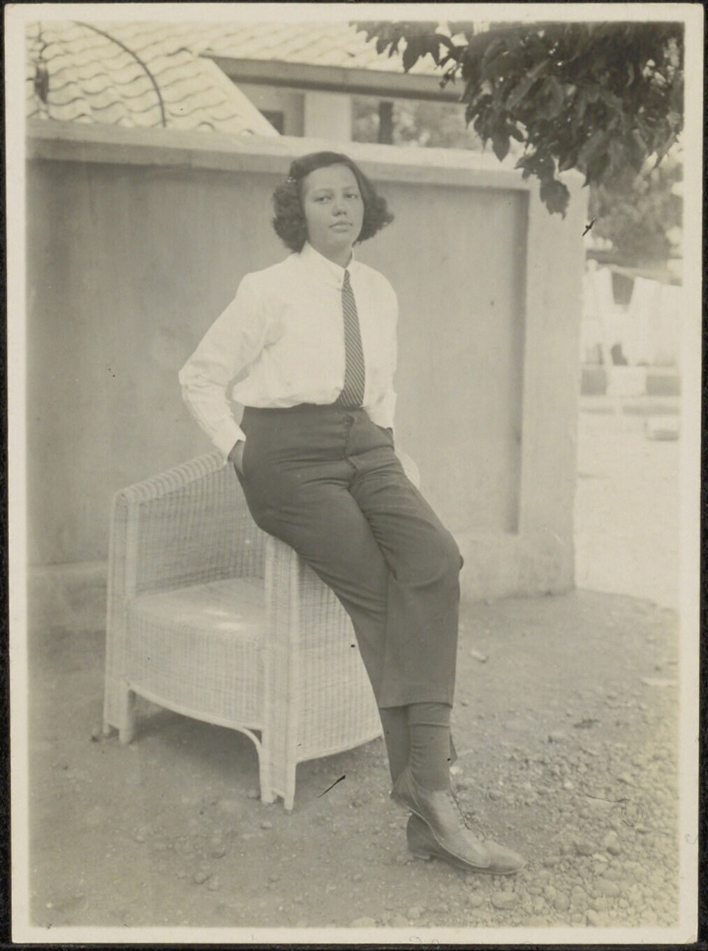 Portret van een jonge vrouw, gekleed in mannenkleding