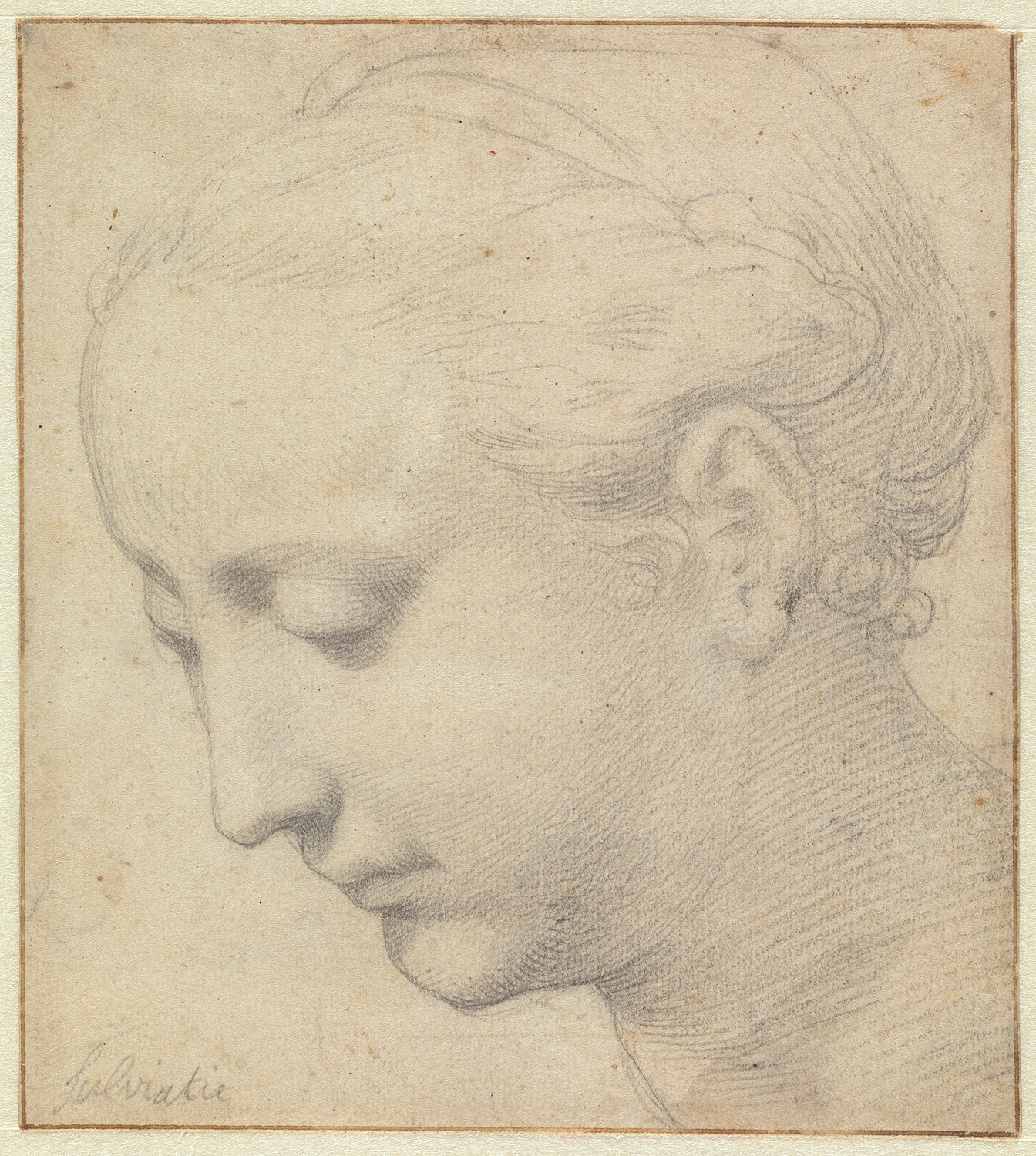 Hoofd van een jonge vrouw, neerziend en naar rechts ...