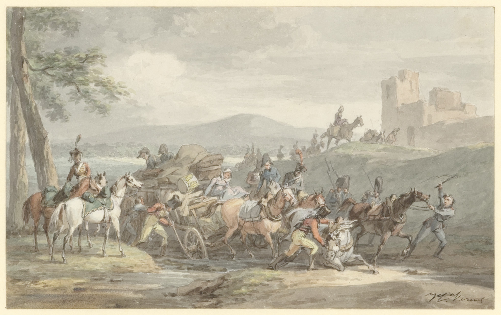 Een legerwagen in eene beek vastgeraakt zijnde