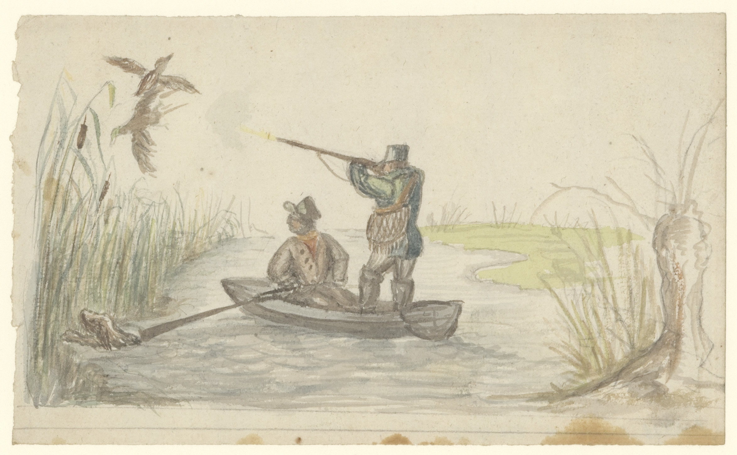 Een man rust tegen eenen boom, aan den oever van een...