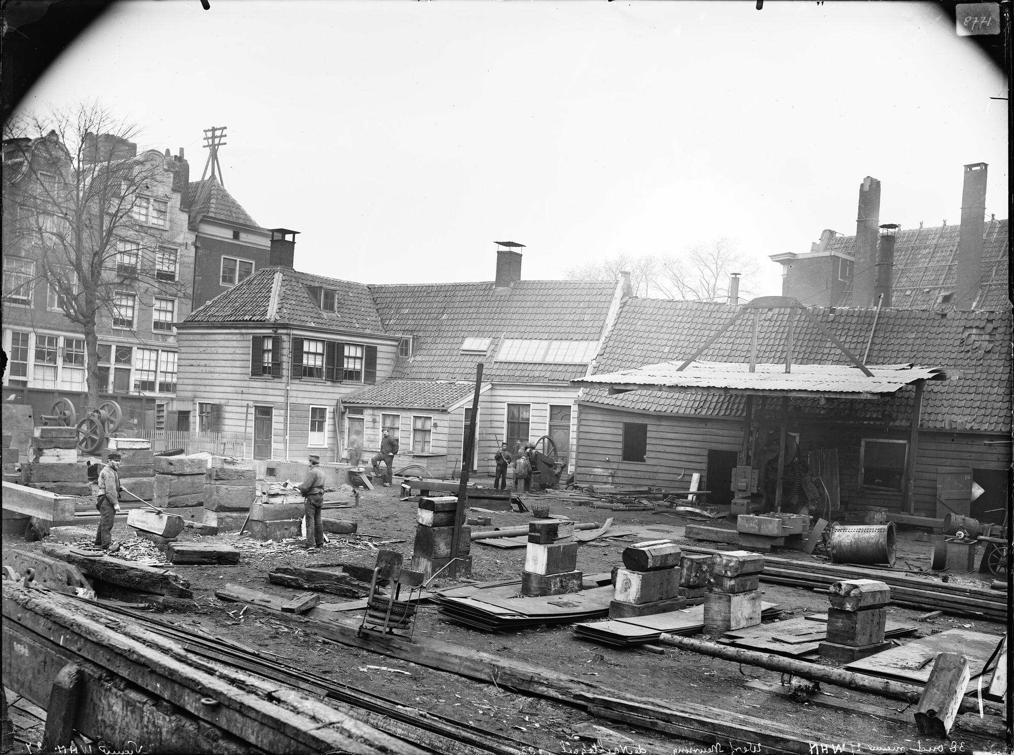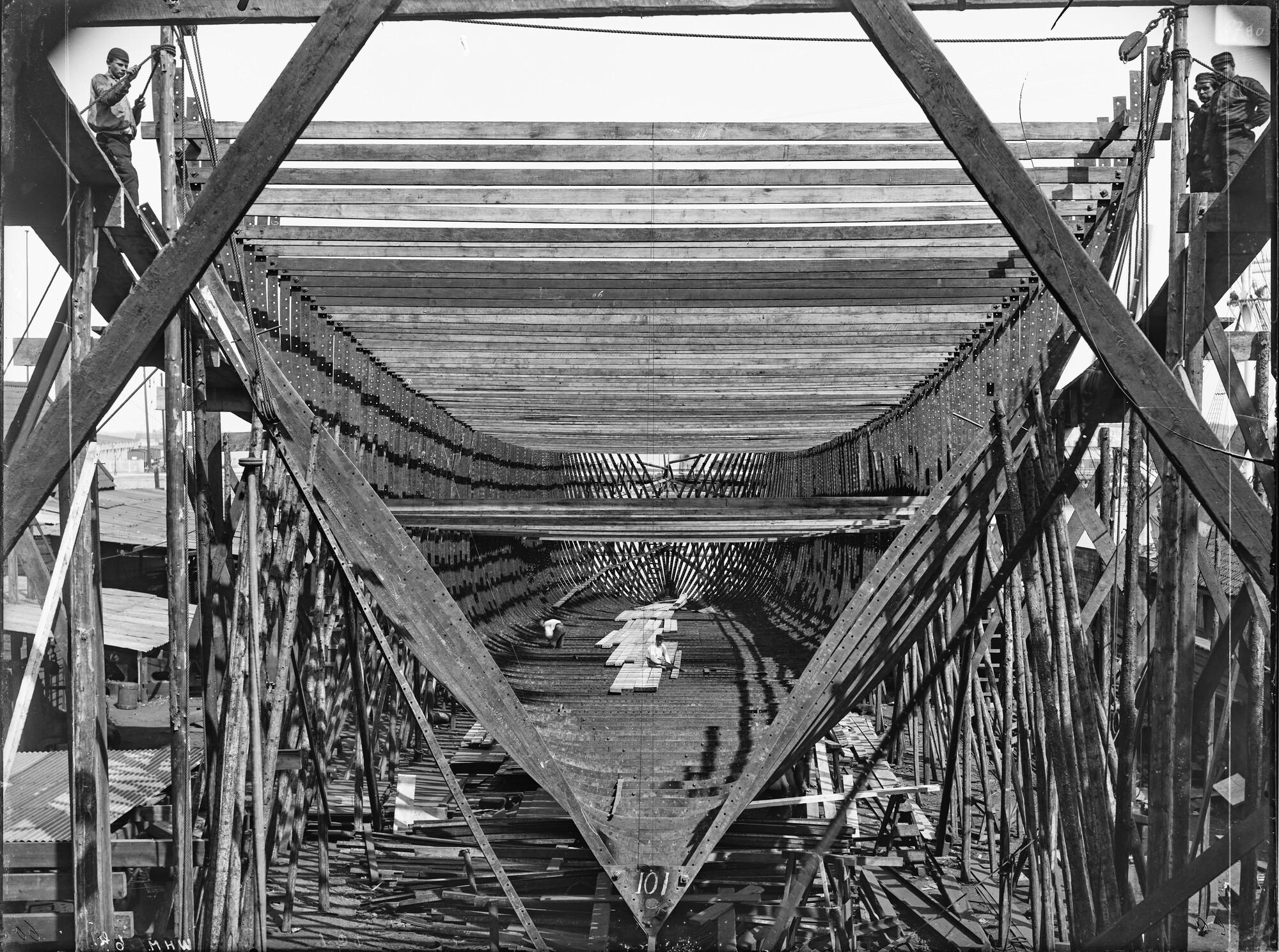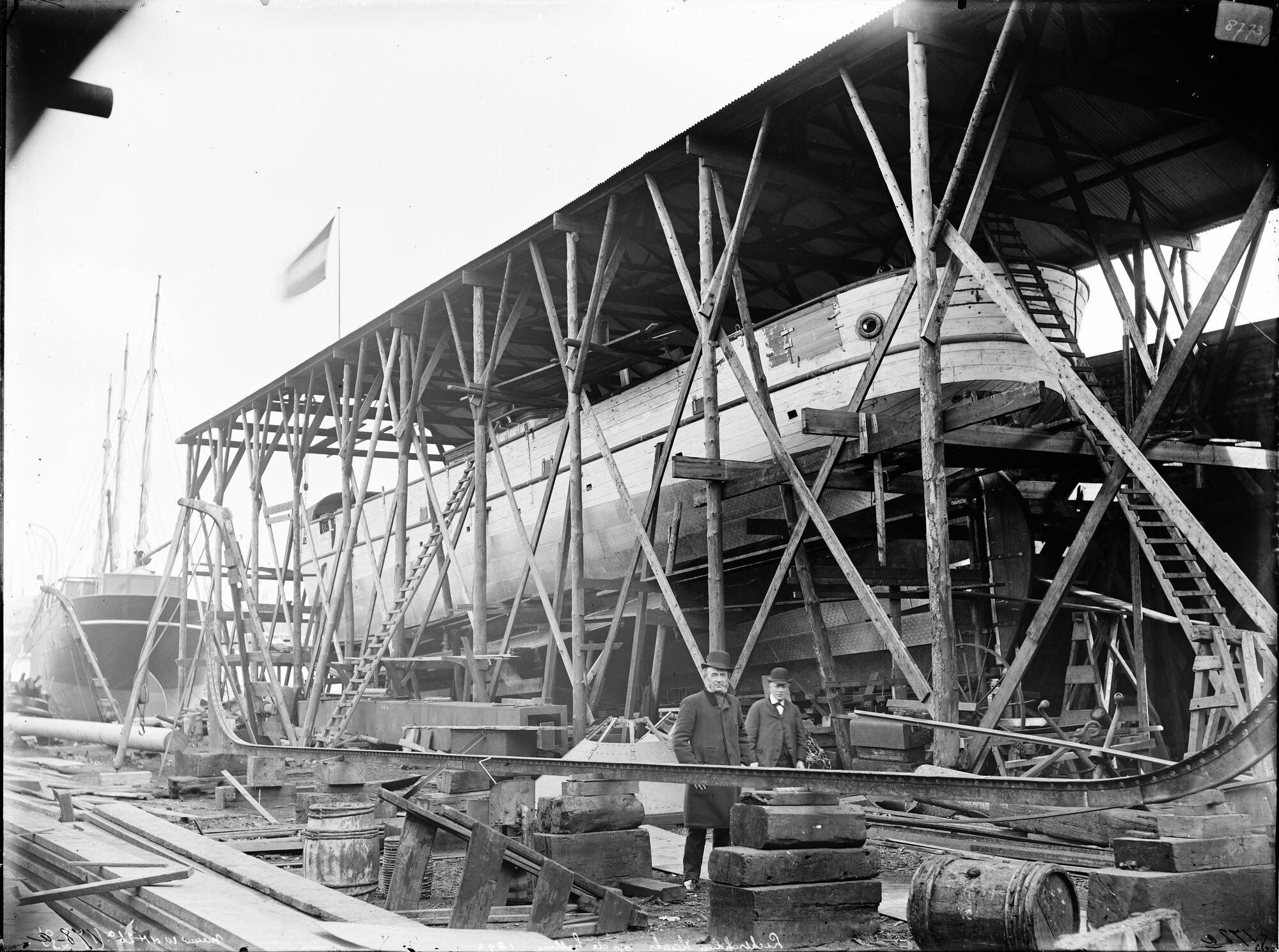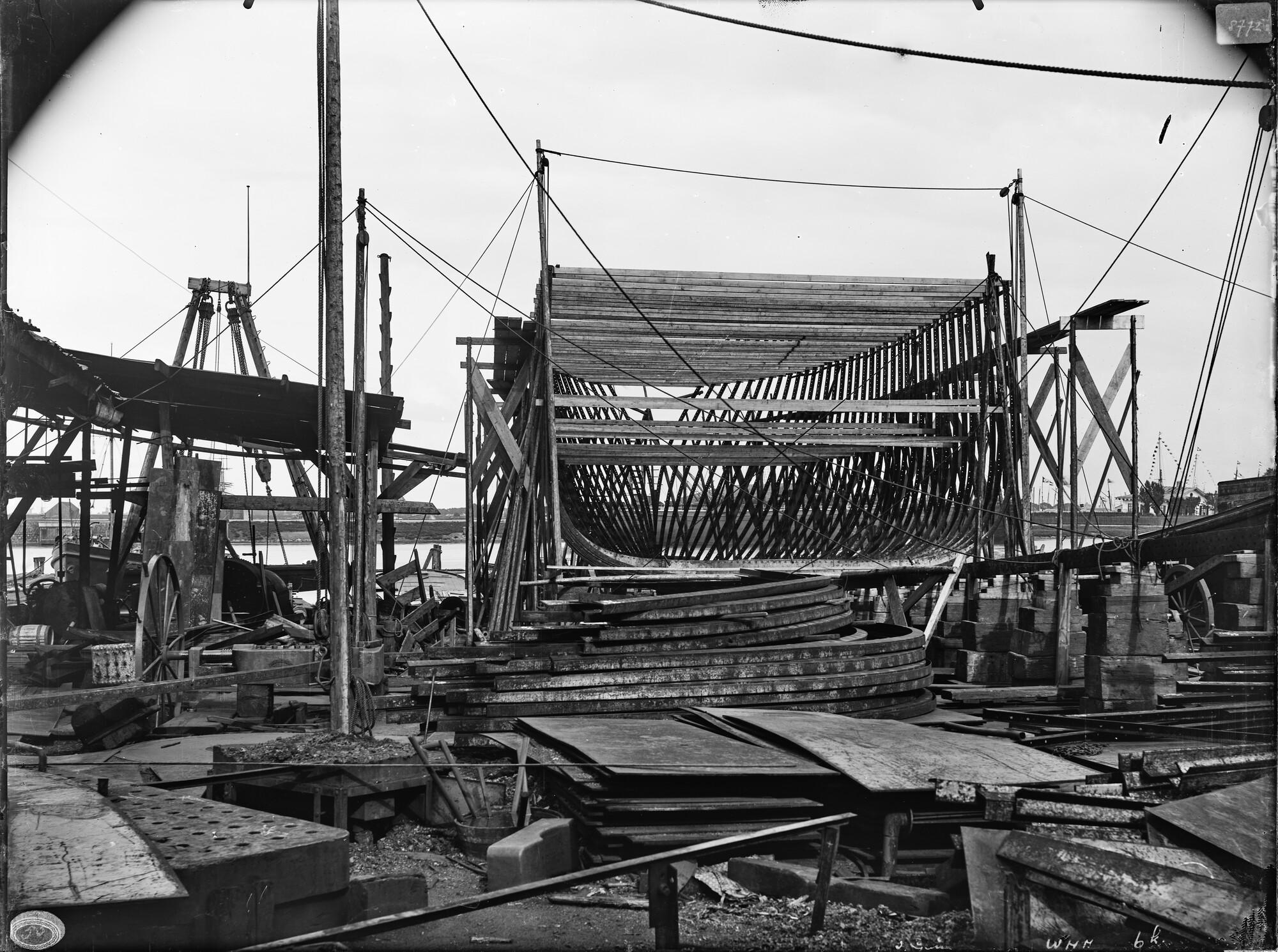 Het stalen barkschip Van Galen in aanbouw op de werf...