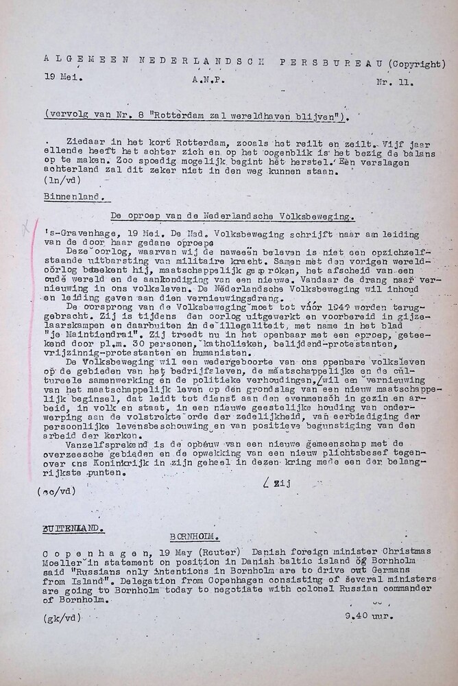 Algemeen Nederlandsch Persbureau, mededelingen, 19 m...