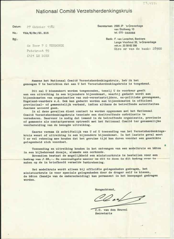 Brief van Nationaal Comité Verzetsherdenkingskruis d...