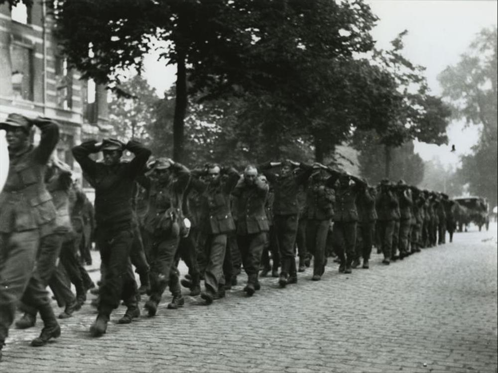 afmars in colonne Duitse krijgsgevangenen in Nijmegen